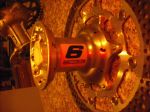 I have to clean up but I am pretty sure its a Factory Suzuki Hub, It's got Tedesco and a number 9 decal on the hub with a oversized 280mm disc and the hub is polished.I don't know what its made out of.... bearings look new.